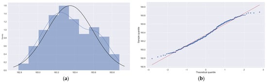 Through calculation, the KS test statistic is 0.06, and the p-value is 0.3003. That is, the null hypothesis is not rejected, and it is considered that there is no significant difference between the sample distribution and the normal distribution. Therefore, it can be considered that the water level change can be fitted to a normal distribution. The histogram and QQ plot are shown in Figure 4a,b.