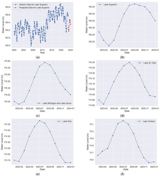 Predicted results: (a) Lake Superior raw data and best water level predictions; (b–f) best water level predictions for Lake Superior, Lake Michigan and Lake Huron, Lake St. Clair, Lake Erie, and Lake Ontario in that order.