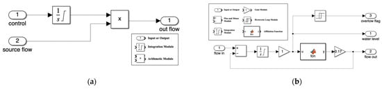For the latter, the subsystem is used to simulate the dynamic operation of the tank. The difference between the inflow flow rate and the outflow flow rate is accumulated by the integration module to calculate the water level change, and then the real-time water level is output through the gain 1. At the same time, the water level signal is input to the hysteresis loop module to determine whether it is overflowed or not, and the overflow flag is output if it exceeds the threshold. In addition, the relationship between water level and flow is processed through the affiliation function to calculate the outflow flow, and finally the outflow flow is output through the gain 0.17 to form a dynamic equilibrium simulation of inflow, outflow, and water level.