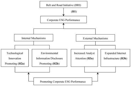 The BRI is widely recognized for its economic benefits; however, its environmental implications, particularly regarding carbon emissions and pollution from infrastructure projects, are increasingly under scrutiny. These environmental challenges, although less frequently highlighted, pose significant risks to global sustainability [5,6]. In response, China has implemented proactive measures to mitigate these impacts and align the BRI with broader sustainable development goals [7,8]. Notable efforts include establishing the Belt and Road Green Development International Alliance, led by China’s Ministry of Ecology and Environment in collaboration with partner nations. Furthermore, China’s formal partnership with the United Nations Environment Programme to build a green Belt and Road underscores its commitment to embedding sustainability into the core of this global initiative. These actions highlight the BRI’s potential not only as an economic catalyst but also as a significant force in advancing global environmental stewardship. This study aims to address the following core questions: How does the BRI, as one of the most influential global development initiatives of the 21st century, influence the environmental, social, and governance (ESG) performance of Chinese enterprises through both internal and external mechanisms? Specifically, what impact does the BRI, as a strategic framework that integrates economic drivers with sustainable development objectives, have on corporate ESG performance? Furthermore, at the mechanistic level, how does the BRI establish synergistic pathways for ESG enhancement through internal factors such as incentives for technological innovation and improvements in environmental information disclosure as well as external factors like heightened analyst attention and the enhancement of digital infrastructure? Additionally, is there heterogeneity in the ESG performance responses to BRI policies among enterprises with varying ownership structures, growth stages, sizes, and regional economic gradients?