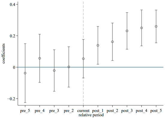 Here, k < 0 indicates the k-th year before the BRI implementation, and k > 0 indicates the k-th year after the initiative’s implementation. represents a series of year dummy variables. The year immediately preceding the initiative’s implementation is used as the base year. In Equation (2), the key coefficient of interest is . If is insignificant before the BRI implementation and becomes significant afterward, it indicates that the parallel trend assumption holds.