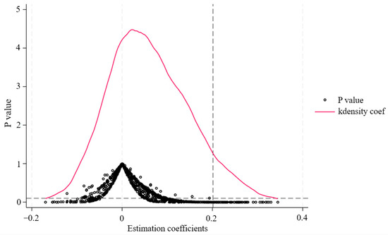 The observed improvement in corporate ESG performance may result from random factors rather than the BRI. To eliminate the potential influence of random factors, this study conducts a placebo test within a counterfactual framework. First, the study randomly assigns the implementation time of the BRI for each pilot firm. Second, 266 pilot companies are randomly selected as the treatment group, while the remaining companies constitute the control group. Utilizing the baseline regression model, Monte Carlo simulations are performed and repeated 500 times to obtain the estimated coefficients and p-values. Figure 3 presents the placebo test results for the impact of the BRI on corporate ESG performance. The results indicate that the estimated coefficients of the dummy policy variable are primarily concentrated around zero, and most of these coefficients are not significant. In contrast, the true value (0.2013) is significantly different from the estimated results in the placebo test. These findings align with the empirical results from the baseline regression, providing evidence from a counterfactual perspective that the BRI enhances corporate ESG performance. Although there is minor overlap at the boundary, the majority of the placebo estimates remain well below the actual coefficient. The kernel density curve peaks near zero, andthe robustness of this result is supported by 500 iterations of Monte Carlo simulations. This reinforces the validity of the treatment effect and demonstrates that it is unlikely to result from stochastic variation.
