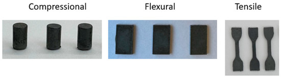 Mechanical testing was performed in accordance with modified ASTM standards: compressive testing followed a protocol adapted from ASTM D695 [66], tensile testing from ASTM D638 [67] (dog bone geometry), and flexural testing from ASTM D790 [68] (single cantilever mode).