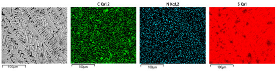 Scanning electron microscopy with energy dispersive X-ray analysis (SEM–EDX) was used to assess the microscopic structure and homogeneity of PANS90. The images in Figure 2 demonstrate that the absence of sulfur in the sulfur map corresponds to regions with a higher abundance of carbon. This observation suggests a spatial separation between sulfur-rich and organic-rich domains at this length scale.