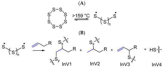 General scheme depicting the generation of sulfur radicals from S8 (A) and their reaction with alkenes during inverse vulcanization (B).