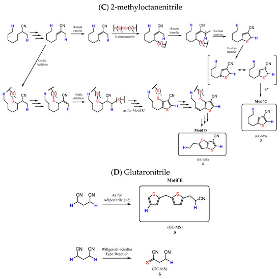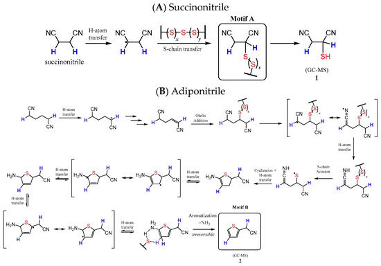 Several S–C bond-forming reactions, including the formation of thiophene rings, were observed in GC-MS analyses of model compound reaction mixtures (Scheme 2). Several reactivity pathways consistent with established reactions of elemental sulfur [60,61,97,98,99,100] with small molecules were deduced based on the compounds observed by GC-MS analysis. Succinonitrile (Scheme 2A) undergoes H-atom abstraction from the nitrile a-carbon followed by reaction with a polysulfur chain that leads to Motif A, which, under thermal conditions, could lead to thiol 1,as observed by GC-MS. Thiol 1 could also form by conversion of the initially formed radical to the olefin, followed by olefin addition, analogous to the pathway reported for reactions of benzylic radicals with elemental sulfur under the same reaction conditions used here [61].