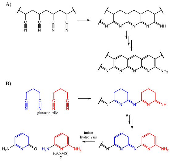 Known decomposition pathway for PAN (A) and formation of 7 (observed by GC-MS) from glutaronitrile via an analogous mechanism (B).