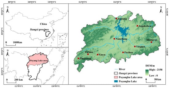 The Poyang Lake Region is in northern Jiangxi Province, China, linked to the Yangtze River. Its geographic range spans 113°34′ E–118°28′ E and 26°57′ N–30°04′ N, covering more than 9 million hectares (Figure 1). The region includes 64 cities of various sizes, with a permanent population of approximately 30.67 million, accounting for about 68% of Jiangxi Province’s total population, and an urbanization rate of 61%. As a significant strategic economic development area [44], the Poyang Lake Region features a subtropical monsoon climate with distinct seasons, an annual average temperature of 18 °C, and a multi-year average precipitation of 1700 mm.