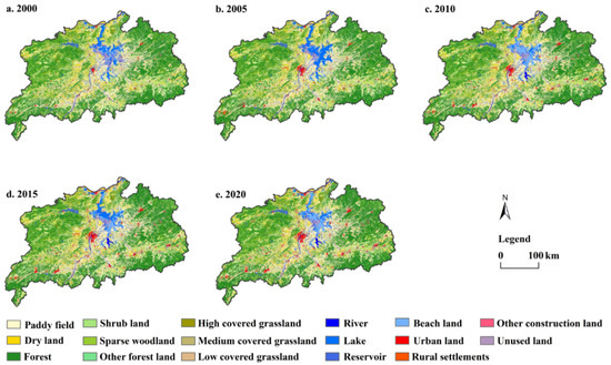 Overall, throughout the timeframe spanning from 2000 to 2020, the LU area distribution ranked as follows: Forest land > Cultivated land > Water area > Grassland > Construction land > Unused land (Table 4). The overall extent of Cultivated land exhibited a minor decline, falling from 32.8% in 2000 to 31.7% in 2020. Specifically, both Paddy field and Dry land experienced a slight reduction in area. The area of Forest land exhibited a different trend, reaching its peak in 2010 before slightly declining, with Shrub land and Sparse woodland continuously decreasing. The area of Grassland remained relatively stable, with its proportion decreasing slightly from 3.4% in 2000 to 3.1% in 2020. The area of Water area showed an initial increase followed by stabilization, with significant fluctuations in River and Lake areas, while the Reservoir area remained relatively stable, and Beach land outspread significantly. The area of Construction land nearly doubled over the 20 years, increasing from 2.2% in 2000 to 4.3% in 2020. Since 2000, the area of Unused land decreased from 1.0% to 0.6%.