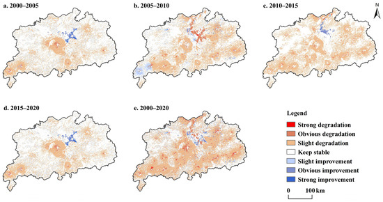 The HD scores calculated by ‘InVEST’ were categorized into seven levels: strong degradation (HQD < −0.5), obvious degradation (−0.5 ≤ HQD < −0.2), slight degradation (−0.2 ≤ HQD < 0), keep stable (HQD = 0), slight improvement (0 < HQD ≤ 0.2), obvious improvement (0.2 < HQD ≤ 0.5), and strong improvement (HQD > 0.5). The areas and proportions of these categories were analyzed (Table 5) along with their spatial distribution (Figure 4).