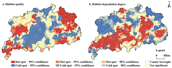 Given the swift pace of urban growth and intense land development, changes in LU can effectively evaluate the spatial and temporal shifts of regional HQ [65,66]. Through HQ research, the ecological condition of a region or even the global environment at different times and spaces can be evaluated [19,41,67]. Studies show that HD can reflect the degree of stress on habitats, with higher degradation indicating higher threats and a greater likelihood of HD [68]. This study found an overall decline in HQ over 20 years, with the greatest degradation between 2010 and 2015. The most severe degradation occurred in the urban belt extending from Nanchang city and the surrounding cities of Pingxiang, Yichun, Xinyu, Fuzhou, Yingtan, and Shangrao, further indicating that the rapid economic growth, urbanization, and industrialization have negative impacts on regional HQ [68,69]. Hotspot and cold spot analyses showed that HQ hotspots were concentrated in the northeast, southeast, and western mountainous areas, while cold spots were concentrated in urban and suburban areas. This is mainly due to the fact that the rugged terrain of the mountainous area preserves rich natural resources, which include nature reserves like Lushan National Nature Reserve, Jiuling Mountain National Nature Reserve, and Taohongling National Nature Reserve. Urbanization and industrial development are mainly concentrated in the cities and their adjacent areas, which was also found by Wang et al. [70] on HQ evolution in Shenzhen.