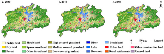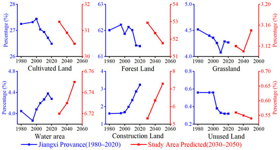 Proportions of various LU types in Jiangxi province (1980–2020) and projected change trends in LU proportions in the study area (2030–2050).
