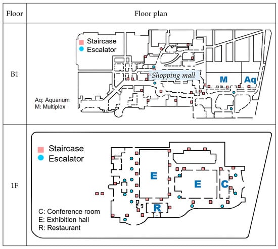 The target building used for the simulations is a representative complex building with underground connections in Seoul, South Korea. The building consists of four basement and four above-ground levels, forming an interconnected underground complex. The building houses various facilities, including shopping malls, multiplex cinemas, aquariums, exhibition halls, conference rooms, restaurants, and offices (Table 1).