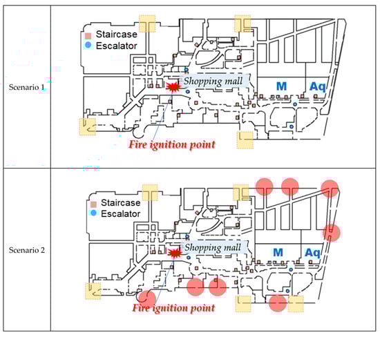 As of 2024, Seoul has 211 complex buildings with underground connections, the highest among all Korean cities [1]. According to Article 2 of the Special Act on Management of Disasters in Super High-Rise Buildings and Complex Buildings with Underground Connections, a complex building with underground connections refers to a structure with at least 11 floors or an accommodation capacity of 5000 persons, with its underground section connected to a subway station or underground shopping arcade. These buildings often house facilities for cultural activities, commerce, transportation, businesses, lodging, and amusements [2]. Hence, the failure of the initial response after a disaster can lead to significant human and property damage in such buildings [3,4,5,6,7]. Specifically, through underground passages in these buildings, fires can spread to nearby structures such as large-scale retail facilities and multiplex cinemas, increasing evacuation times, and exacerbating confusion among occupants [8,9].