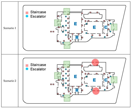 Figure 3 and Figure 4 illustrate the differences among the three scenarios in terms of staircases, escalators, and outside exits for the 1st basement and above-ground (ground to 4F) floors, respectively. Notably, the number of staircases and exits increases with each successive scenario. In the diagrams, newly added exits compared to the previous scenario are highlighted with red circles, while existing exits from the previous scenario are marked with yellow squares.