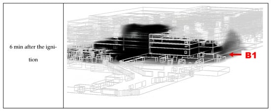 Regarding the time-dependent smoke spread, 6 min after the onset of the fire, a significant amount of smoke began accumulating in parts of the first basement floor (shopping mall) and quickly spread to the upper floors, including the first ground floor, via both direct and emergency staircases (Figure 5). At 8 min and 10 s (the maximum allowable safe egress time), smoke filled the entire building, including the first basement floor. After 36 min, the smoke density increased further and completely engulfed the building (Figure 5).