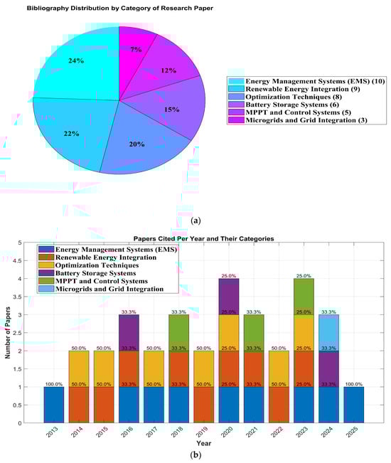 This is a bibliographic analysis of the categorization and visualization of 41 research papers on Energy Management Systems, Renewable Energy Integration, optimization techniques, battery storage systems, MPPT and control systems, and microgrids and grid integration. Accordingly, the papers are sorted in six primary groups: Energy Management Systems (EMS) [,,,,,,,,,]; Renewable Energy Integration [,,,,,,,,]; optimization techniques [,,,,,,,]; battery storage systems [,,,,,]; MPPT and control systems [,,,,], and microgrids and grid two visualizations are offered to help understand the distribution of these papers as shown in Figure 1a a pie chart pie graph with the percentage distribution of papers among the categories and Figure 1b a bar graph bar chart with the number of papers cited in a year across the categories. Energy Management Systems (EMS) have the biggest share (24%), Renewable Energy Integration has 22%, and optimization techniques have 20%. With peaks for specific years, including 2020 and 2023, it clearly demarcates that areas such as optimization techniques and Renewable Energy Integration have been showing increased research activity. They provide an overall overview of the research landscape around the matters of energy management and renewable energy systems, highlighting the major role they play in coping with modern energy problems.