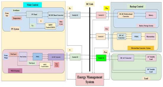 The hybrid energy system comprises four basic components: solar PV systems, wind energy conversion systems (WECSs), battery storage systems (BSSs), and microturbine (MT). This section relates to the complete design of the system, its connection, and mathematical modeling in conjunction with how effectively it is able to control energy in different operational conditions. This hybrid energy system conducts nonstop power generation and delivery by incorporating different types of technologies. It has a 15 kw solar PV system that has been designed to be reliable enough and efficient under different solar irradiance conditions. It consists of an additional part, which is a 15-kilowatt wind energy conversion system designed to efficiently harness wind energy for different wind speed runs. The energy-storing component of this system is the 100 amp hour battery, which is meant to stabilize the load. Power outages are avoided through the backup supplied by the 30 kw microturbine, which is operational when the load is high or renewable energy production is inadequate. An intricate Energy Management System (EMS) manages the entire centralized DC bus within those components. Benefits extend to improving the overall efficiency and reliability of the system, with reduced energy losses, while ensuring the effective control of loads. The overall basic structure of the hybrid energy management standalone system is shown in Figure 2.