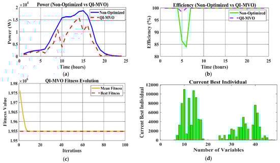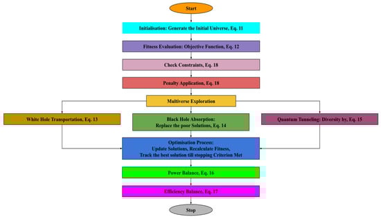 The rapid increase in global energy demand, coupled with the urgent need to reduce carbon emissions, has led to a growing reliance on renewable energy sources such as solar and wind power. Hybrid energy systems, which integrate multiple renewable energy sources with backup and storage technologies, have emerged as a sustainable solution to address the intermittency and variability associated with renewable energy generation [,]. However, the effective management of such systems remains a significant challenge, particularly under dynamic load and environmental conditions. This study proposes a novel Quantum-Inspired Multiverse Optimization (QI-MVO) algorithm to address these challenges, offering a computationally efficient and reliable solution for energy management in hybrid systems.