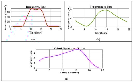 The solar PV system converts solar irradiance into electrical energy [,]. The output power of a PV module is governed by its characteristic equation, as given in Equation (1):