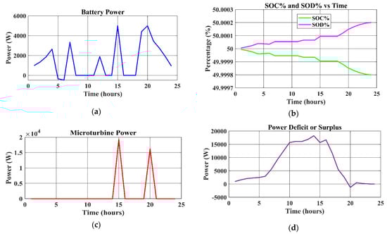 The MT serves as a backup energy provider whenever renewable power generation cannot meet the demand [,]. Table 5 shows a detailed specification list for the microturbine system. The microturbine output power depends on its input fuel energy and operational efficiency according to Equation (6):