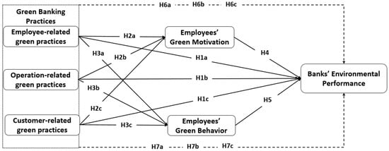 Furthermore, all bank personnel should promote the bank’s environmental credentials to recruit individuals with similar beliefs [,]. Environmental awareness training reduces waste and increases employee involvement in the banks’ environmental performance []. The human resource department can help managers build eco-KPIs, such as water, electricity, and raw materials in relation to garbage and recycling []. Simultaneously, incentives related to these KPIs can be used to incentivize environmentally responsible behavior, promoting a more sustainable and environmentally friendly workplace []. Rayner and Morgan [] have demonstrated that employees perform optimally when they possess the requisite knowledge, skills, and abilities; are motivated; and desire to be rewarded for their actions. Additionally, they thrive when their working environments offer suitable opportunities, assistance, and motivation []. Banks’ environmental performance will benefit the banks, as each employee’s activities and their positive effects on environmental sustainability yield valuable, enlightening outcomes. Positive environmental practices are integrated when a bank’s workforce engages with environmental issues driven by motivations [,]. Consequently, the offered hypotheses are as follows: