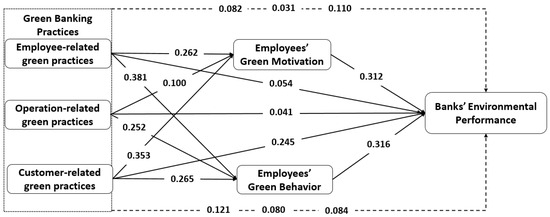 Table 4 reveals that employee-related (β = 0.054; t = 1.058; p > 0.05) and operation-related green practices (β = 0.041; t = 0.695; p > 0.05) had an insignificant association with banks’ environmental performance, while customer-related green practices (β = 0.245; t = 4.265; p < 0.05) significantly influenced banks’ environmental performance. Furthermore, employee-related (β = 0.262; t = 4.720; p > 0.05) and customer-related green practices (β = 0.353; t = 5.683; p > 0.05) were significantly associated with banks’ environmental performance, whereas operation-related green practices (β = 0.100; t = 1.509; p > 0.05) had an insignificant influence on banks’ environmental performance. Similarly, employee-related (β = 0.381; t = 6.739; p < 0.05), operation-related (β = 0.252; t = 4.908; p < 0.05), and customer-related green practices (β = 0.265; t = 4.170; p < 0.05) significantly influenced employee green behavior. In addition, employee green motivation (β = 0.312; t = 6.591; p < 0.05) and green behavior (β = 0.316; t = 4.189; p < 0.05) were significantly associated with banks’ environmental performance.
