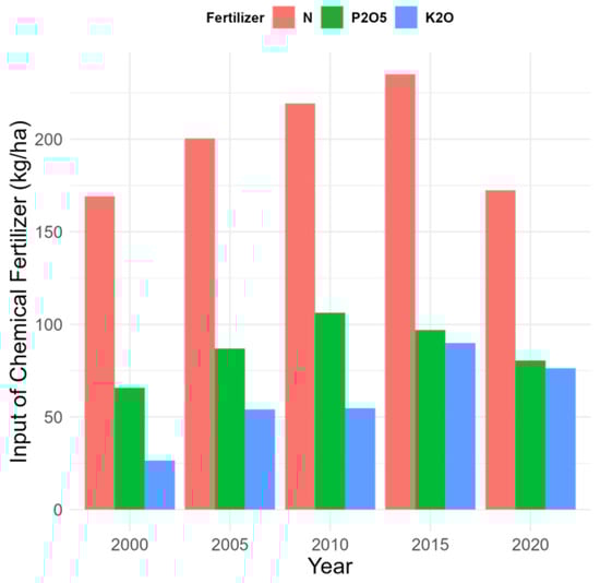 The chemical fertilizer application in China from 2000 to 2020. Source: Data are from the Food and Agriculture Organization Corporate Statistical Database [40].