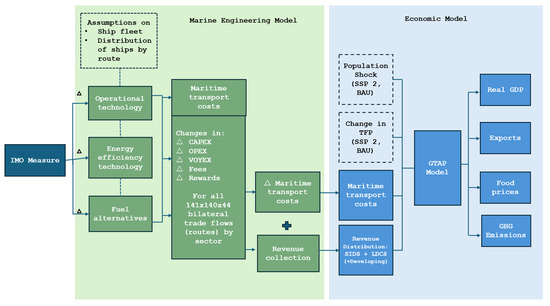 Second, the maritime transport cost difference between IMO and BAU scenarios (in percentage terms) is fed into the economic modeling as a transport cost shock. This shock accounts for the changes in the cost of international shipping to quantify the regional economic effects of the measures in the 2027–2035 period. It is worth mentioning that the simulations are performed annually from 2018 to 2035, as the base year of GTAP is 2017; however, the medium-term measures enter into force only in 2027. The designed scenarios used in the economic approach (see Section 3.2) are in line with those simulated by the MEM (see [4] for more details). Details of the empirical framework and its two methods are illustrated in Figure 1.