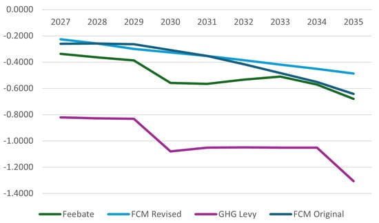 The selection of these four measures is based on their potential to balance environmental ambition with economic feasibility. The GHG levy, for example, provides a predictable price signal, fostering investment in cleaner technologies. The feebate mechanism directly incentivizes early adoption of zero-emission fuels and vessels by offsetting cost differentials. Meanwhile, the flexibility compliance mechanisms allow firms to optimize compliance strategies, enabling a smoother transition. The FCMs incorporate a mix of command-and-control regulations and market-based instruments. All the measures under discussion align with broader policy goals, as their parameters are set to achieve decarbonization targets at the IMO.