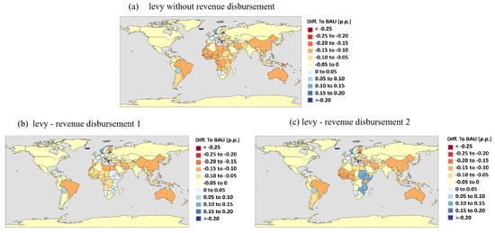 We incorporate revenue distribution in two of the simulated scenarios. We model the revenue distribution exogenously in GTAP by first calculating the global revenue generated in the levy scenario and then redistributing it as income transfers to the countries negatively affected, according to two criteria levels. The first level specifies the eligible countries as those that have experienced a negative GDP impact in the levy scenario without revenue distribution, selecting from SIDS, LDCS, and developing countries. The two revenue disbursement scenarios are as follows: (i) Revenue disbursement scenario 1—includes SIDS, LDCS, and developing countries; (ii) Revenue disbursement scenario 2— includes only SIDS and LDCS.