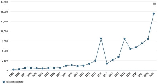 As the purpose of this study is to model the economic component of sustainable development in the context of the transport industry, the search for the combination of the keywords “sustainable development” AND “transport infrastructure” AND “econometric modelling” was conducted (Figure 2). There are noticeably fewer publications, but there is a growing trend which indicates the growing interest of researchers in the use of econometric modeling methods. In 2014 and 2018, there were bursts of activity, while the maximum number of articles was reached in 2023—17,379 articles.