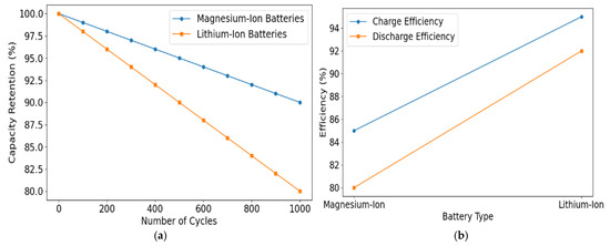 One of the standout features of magnesium-ion batteries is their superior cycle stability compared to lithium-ion systems. The absence of dendrite formation in Mg-ion batteries is a major safety advantage. Dendrite growth in lithium-ion batteries often leads to short circuits and safety hazards, whereas magnesium-ion batteries exhibit stable performance even after extensive cycling. In our tests, the Mg-ion batteries retained excellent capacity after 1000 charge-discharge cycles. The capacity degradation was minimal, with less than 10% loss in energy storage throughout these cycles. This stability indicates that Mg-ion batteries could outperform lithium-ion batteries in applications requiring long-term reliability, such as in electric vehicles, where longevity is critical for the overall performance and safety of the car [43,44]. However, while cycle stability is a clear advantage, challenges related to slow ion kinetics still impact the charge-discharge rate and energy efficiency, as discussed in the next section (Table 4).