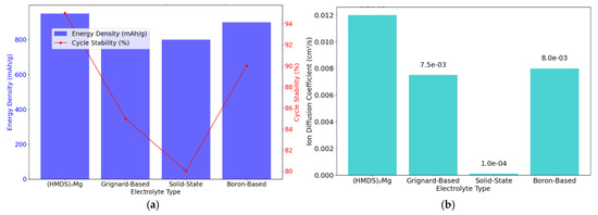 The primary technical hurdle for magnesium-ion batteries is the slow diffusion of magnesium ions through the electrolyte and cathode materials. Magnesium’s divalent nature leads to stronger interactions with the surrounding anions, which impedes the ion’s movement and reduces the conductivity of the battery. Our models confirmed these findings based on molecular dynamics (MD) and density functional theory (DFT) simulations, showing that magnesium ions experience significant electrostatic resistance, particularly in conventional cathode materials. Several alternative cathode materials, including sulphur-based compounds and polyanionic structures, were tested to address these issues. The sulphur-based cathodes exhibited improved ion diffusion rates, enhanced capacity retention and lower polarisation than traditional materials. However, while sulphur-based cathodes demonstrated promise, the electrolyte formulation remained a limiting factor. One significant challenge with Mg-ion batteries is the formation of passivation layers on the magnesium anode. These layers form when magnesium reacts with the electrolyte, reducing the overall ionic conductivity and battery performance [44,45]. Nonreactive electrolytes, such as (HMDS)2Mg, were tested to mitigate this. These advanced electrolytes exhibited enhanced ionic mobility and reduced passivation layer formation, improving cycling stability and higher energy efficiency. While developing more effective electrolytes is ongoing, these initial results highlight the importance of optimising both anode and electrolyte materials to overcome passivation-related issues and unlock the full potential of Mg-ion technology.