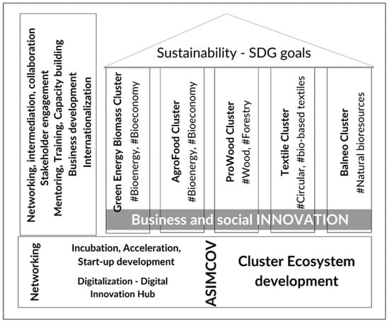 Figure 2 visually represents the biocluster ecosystem, illustrating its role in fostering sustainability and innovation through a structured approach. The diagram’s roof highlights the overarching goals—sustainability and the Sustainable Development Goals (SDGs)—which serve as the foundation for all activities within the ecosystem.