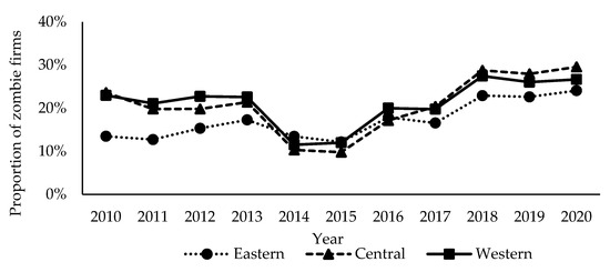 As a typical manifestation of local protectionism and market distortions, zombie firms exert a profound impact on economic sustainability [14]. The economic ramifications of zombie firms encompass the disruption of market feedback mechanisms and the process of “creative destruction” [15], the erosion of production factor allocation efficiency [16,17,18,19], and spillover effects on non-zombie firms [20,21]. Its impact on the DMI as well as sustainable development cannot be ignored either. As shown in Figure 1 (collected through the 2008–2020 China Tax Survey Database), the proportion of zombie firms in China is lower in the eastern region, which benefits from well-developed infrastructure and higher levels of innovation. In contrast, the central and western regions show a higher proportion of zombie firms. This trend mirrors the regional distribution of market segmentation observed in China.
