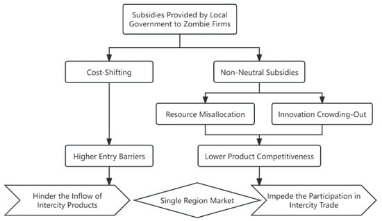Finally, subsidies to zombie firms have exacerbated the fiscal unsustainability of local governments, potentially prompting cost-shifting tactics. Fiscal cost shifting refers to the strategic practice through which local governments transfer part of their fiscal expenditure pressures to other entities. This phenomenon can be categorized into two distinct types based on the target of shifting: intergovernmental shifting and enterprise-level shifting. The intergovernmental fiscal cost shifting mechanism primarily operates through fiscal instruments, particularly transfer payments, enabling local governments to redistribute fiscal burdens to the central government or other regional governments via common pool channels [47]. At the enterprise level, fiscal cost shifting typically manifests through strategic government–business interactions. When confronted with substantial fiscal pressures, local governments may transfer certain social responsibilities or expenditure burdens to enterprises within their jurisdiction to alleviate fiscal stress [48]. In the context of an increasingly integrated national production division system, a significant transformation has occurred in local governments’ revenue sources. Through cross-regional commercial flows, local government’s revenue sources now extend beyond traditional tax contributions to encompass non-tax administrative revenues [49]. These alternative revenue streams are predominantly generated through market access barriers, including administrative licensing requirements and elevated market entry standards.