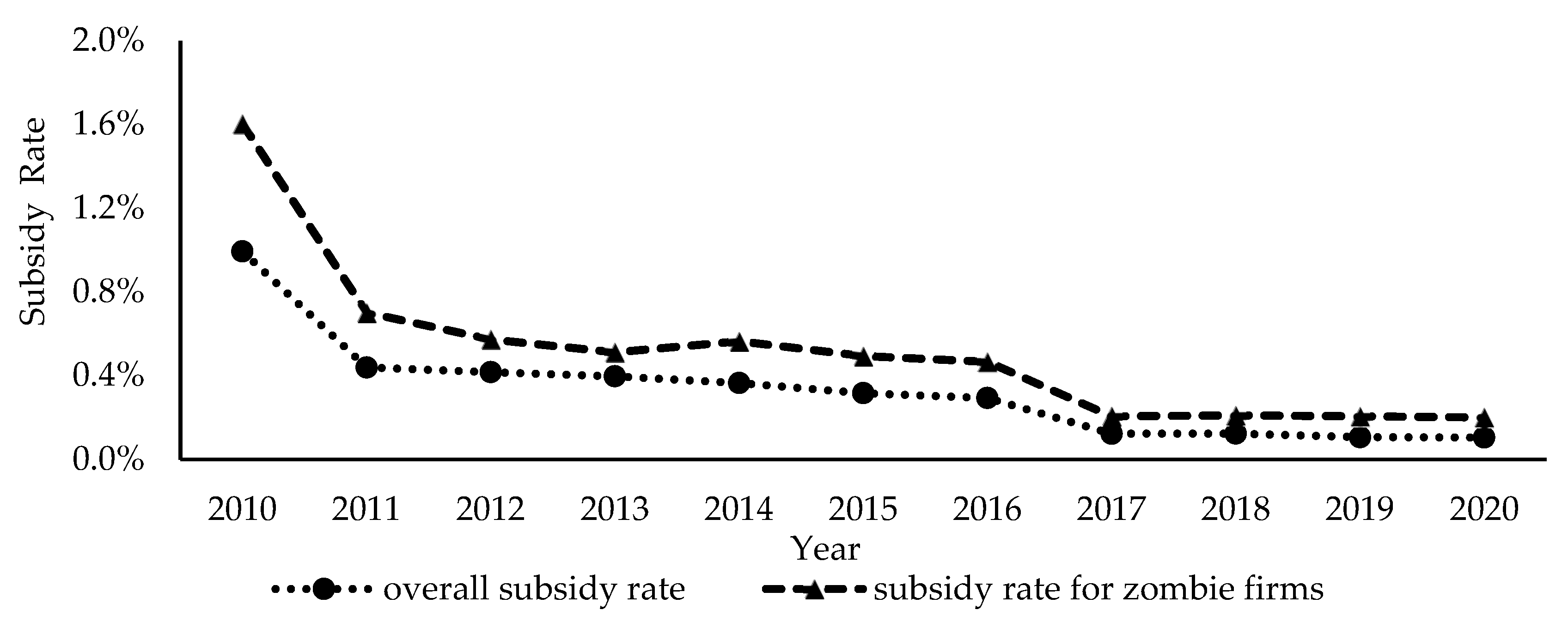 - Liu, G.; Zhang, X.; Zhang, W.; Wang, D. The Impact of Government Subsidies on the Capacity Utilization of Zombie Firms. Econ. Model. 2019, 83, 51–64. [Google Scholar] [CrossRef]