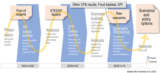 As part of the CFB project, we established a citizen and an expert advisory board as a participative steering group for the whole project. The project developed three explorative scenarios for Graz on plausible futures for promoting regional diets using a multi-stage Delphi-based expert survey [20,25,26] with participatory elements (cf. Figure 1). In a final scenario workshop held in January 2023, consumers and experts developed options for action related to policy, production, trade, and regional communities based on the scenarios. These options aim to strengthen regional food supply, contribute to sustainable consumption, and reduce dependence on global supply chains. Additionally, the results from other CFB work packages regarding the design of personas with varying diets and the quantitative calculation of the environmental impacts of these diets (cf. [8]) were incorporated as background information during scenario workshop. Scenarios and developed recommendations have received positive feedback from a broader spectrum of actors during a validation workshop in April 2023.