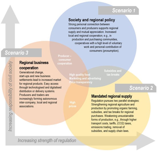 Three scenarios describe plausible futures of a food system promoting regional diets. The space in which the scenarios are located is defined by the critical uncertainties of (x) the strength and abundance of regulatory measures and (y) the degree of assumption of responsibility in civil society (cf. Figure 2). All scenarios share a basic set of control factors (CFs in Table 1), namely, demand for high-quality, healthy, fresh food, e.g., free from harmful substances, promotion of regional and organic products (CF1); increased advertising and marketing for regional, seasonal, organic, and healthy products as ‘environmentally friendly’ (CF22); and price transparency of regional, healthy, and high-quality products (CF20). Scenarios one and two additionally share the following control factor—government support to strengthen regional agriculture and production, e.g., promotion of organic farming, subsidies, and tax concessions for regional purchases (CF26). Scenarios one and three share the following control factor—local and regional cooperation between producers and consumers, e.g., in purchasing and production communities, cooperatives or cooperatives with a high level of voluntary work and personal contribution (based on CF21). Scenarios two and three share the estimated effect of ‘Price convergence at a high price level: organic–conventional and regional–international’, including not only higher production prices for more locally and organically grown food in Austria but also rising prices in the global food market and from conventional production methods in the long term, due to the piling of external effects, often overseen in short-term consideration, such as environmental accumulation of pesticides, loss of topsoil and soil compaction, high energy and resource intensity, or price pressure and discontinuation of farming operations.