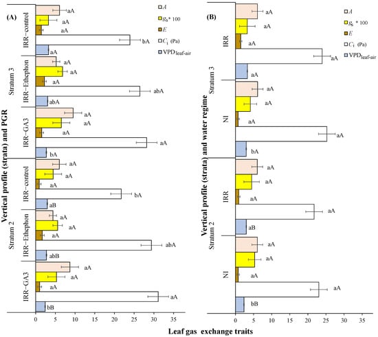 Leaf gas exchange traits: net photosynthesis rate (A, µmol m−2 s−1), stomatal conductance (gs, mmol m−2 s−1), leaf transpiration (E, mmol m−2 s−1), intracellular CO2 concentration (Ci, Pa) leaf-to-air vapor pressure deficit (VPDleaf–air, kPa) in relation to: (A) plant growth regulators (PGR) externally applied (gibberellic acid—GA3, ethylene—Ethephon or control—IRR) or (B) water regime (irrigated—IRR or rainfed—NI) when evaluating different plant strata (S2: 81–160 cm, S3 > 160 cm). Mean values ± SE are shown (n = 2). Inside each figure, different lowercase letters indicate significant differences among PGR treatments or water regimes for each stratum, while different uppercase letters indicate significant differences among strata for each PGR or water regime. gs values were multiplied by 100, allowing al the values to be compared to other traits in the same figure.