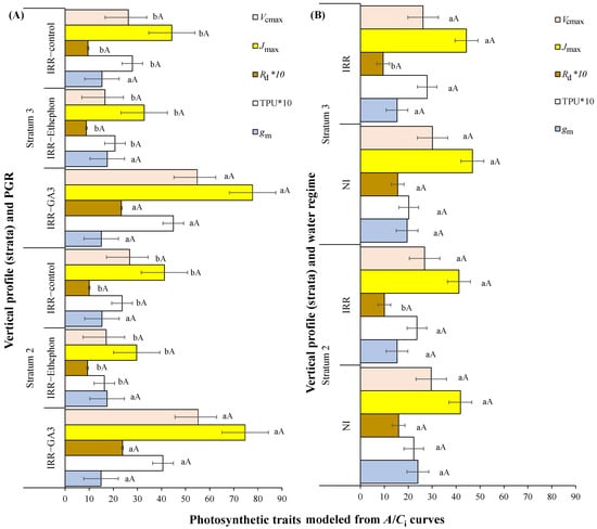 Photosynthetic capacity traits modeled from the A/Ci curves: maximum apparent carboxylation velocity (Vcmax, µmol m−2 s−1), maximum apparent rate of electron transport (Jmax, µmol m−2 s−1), day respiration rate (Rd, µmol m−2 s−1), maximum rate of triose phosphate use (TPU, µmol m−2 s−1), mesophyll conductance (gm, μmol m−2 s−1 Pa−1) in relation to: (A) plant growth regulators (PGR) externally applied (gibberellic acid—GA3, ethylene—Ethephon or control—IRR) or (B) water regime (irrigated—IRR or rainfed—NI) when evaluating different plant strata (S2: 81–160 cm, S3 > 160 cm). Mean values ± SE are shown (n = 2). Inside each figure, different lowercase letters indicate significant differences among PGR treatments or water regimes for each stratum, while different uppercase letters indicate significant differences among strata for each PGR or water regime. Rd and TPU values were multiplied by 10, allowing all of the values to be compared to other traits in the same figure.