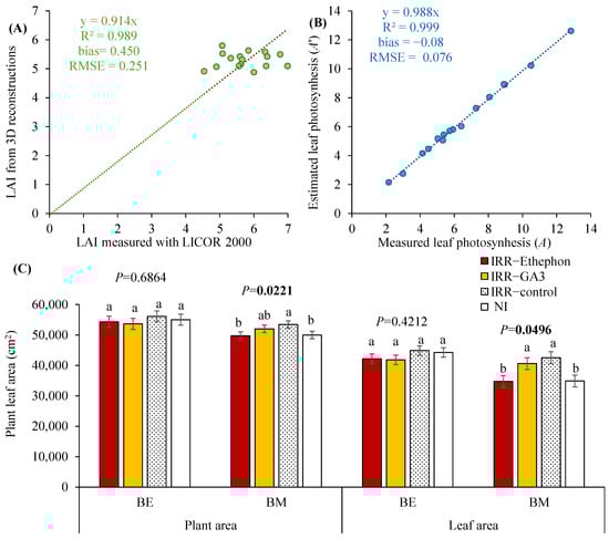The 3D reconstruction manipulations using FSPM modeling: (A) validation of leaf area index (LAI, m2 m−2) measured with LICOR 2000 and reconstructed from 3D mockups in berry expansion (BE) and berry maturation (BM) phenophases; (B) validation of leaf net photosynthesis rate (µmol m−2 s−1) measured (A) with LICOR 6400 and estimated (A′) from mockups at BM phenophase. In (A,B), linear regression equations are shown together with respective R2, bias, RMSE, and 1:1 lines. (C) The plant leaf area of 3D reconstructions (cm2) was estimated before (BE) and after (BM) the application of plant growth regulators (PGR, gibberellic acid—GA3, ethylene—Ethephon or IRR—control) or the modification of water regime (irrigated, IRR—control or rainfed—NI). Mean ± SE and ANOVA p-values (marked in bold when significant) are shown (n = 2). Different lowercase letters indicate significant differences among the four treatments.
