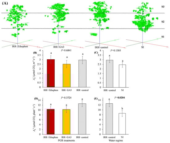 The 3D reconstruction computations of: (A) plant leaf area during the berry maturation phenophase in different plant strata (S1 < 80 cm, S2: 81–160 cm, S3 > 160 cm); (B) mean diurnal leaf photosynthesis (Ap′, µmol m−2 s−1) after the external application of plant growth regulators (PGR, gibberellic acid—GA3, ethylene—Ethephon and water—IRR); (C) Ap′ as a result of water regime (irrigated—IRR or rainfed—NI); (D) mean diurnal plant photosynthesis (Ap″, µmol plant−1 s−1) after the external application of plant growth regulators (gibberellic acid—GA3, ethylene—Ethephon, control—IRR); (E) Ap″ as a result of water regime (irrigated—IRR or rainfed—NI). Mean ± SE and ANOVA p-values (marked in bold when significant) are shown (n = 2). Different lowercase letters inside of the figures indicated significant differences among the treatments.
