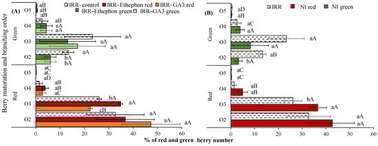 The percentage of red and green berries (maturation group) over 2nd to 5th branching orders (O2 to O5) of plants after the external application of (A) plant growth regulators (PGRs—gibberellic acid—GA3, ethylene—Ethephon, in control—IRR) or (B) water regime (irrigated—IRR, or rainfed—NI). Mean values ± SE are shown (n = 2). Inside each figure, the results of two-way ANOVAs with different lowercase letters indicate significant differences among PGRs or water regimes for each maturation group and branching order, while different uppercase letters indicate significant differences among branching orders for each maturation group and each PGR or water regime.