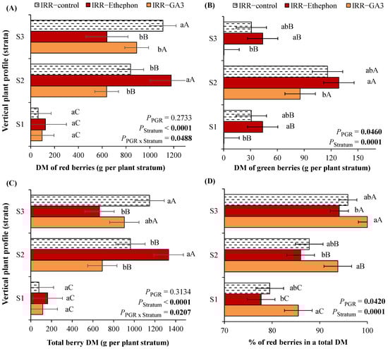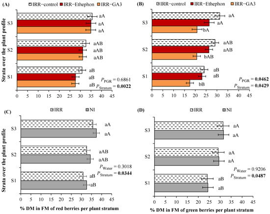 Dry mass (DM) of (A) red, (B) green, and (C) total berries, and (D) percentage of red berries in a total DM after the external application of (A) plant growth regulators (PGR) (gibberellic acid—GA3, ethylene—Ethephon or water—IRR) observed over the three plant strata (S1 < 80 cm; S2: 81–160 cm; S3 > 160 cm). Mean values ± SE and p-values (marked in bold when significant) are shown (n = 4). Inside each figure, different lowercase letters indicate significant differences among PGRs for each stratum, while different uppercase letters indicate significant differences among strata for each PGR.