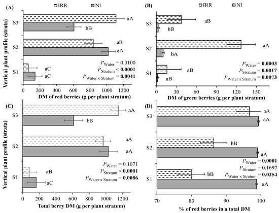 Dry mass (DM) of (A) red, (B) green and (C) total berries, and (D) percentage of red berries in the total DM dependent on water regime (irrigated—IRR or rainfed—NI) over plant strata (S1 < 80 cm; S2: 81–160 cm; S3 > 160 cm). Mean values ± SE and p-values (marked in bold when significant) are shown (n = 4). Inside each figure, different lowercase letters indicate significant differences between water regimes for each stratum, while different uppercase letters indicate significant differences among strata for each water regime.