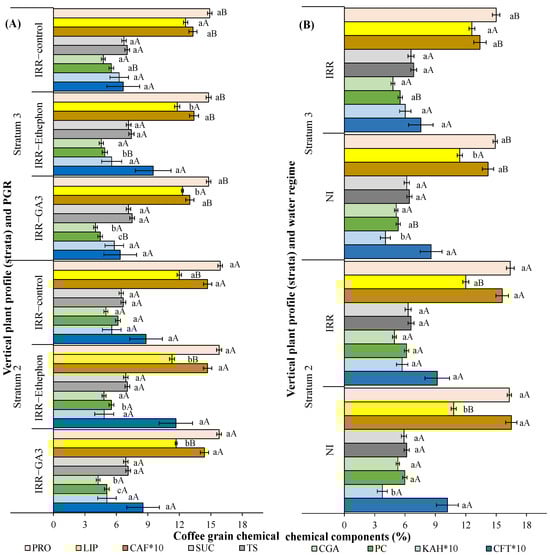 Chemical contents (% of dry matter) of coffee beans: PRO (proteins), lipids (LIP), caffeine (CAF), SUC (sucrose), total soluble sugars (TS), total chlorogenic acids (CGA), phenolic compounds (PC), kahweol (KAH), and cafestol (CFT) in relation to (A) plant growth regulators (PGR) externally applied (gibberellic acid—GA3, ethylene—Ethephon or water—IRR) or (B) water regime (irrigated—IRR or rainfed—NI) over different plant strata (S2: 81–160 cm; S3 > 160 cm). Mean values ± SE are shown (n = 4). Inside each figure, the results of two-way ANOVAs are shown, and different lowercase letters indicate significant differences among PGR treatments or water regimes for each stratum, while different uppercase letters indicate significant differences among strata for each PGR or water regime. CAF, KAH and CFT contents were multiplied by 10, allowing representative values to be compared to those of other chemical components.