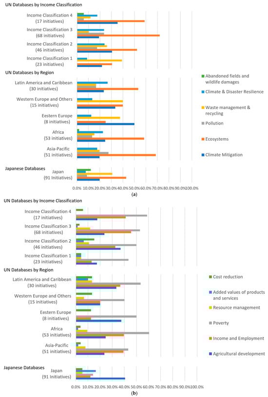 Using the criteria described in the previous section, we selected 157 local initiatives from the four databases operated by UN organizations and 91 from the three databases operated by Japanese government ministries. Subsequently, the initiatives in the UN databases were categorized into income categories of 1 (high income), 2 (upper middle income), 3 (lower middle income), and 4 (low income) based on the UN’s income classifications [114] and regional groups, namely, Asia–Pacific, Africa, Eastern Europe, Western Europe and Others, and Latin America and the Caribbean (LAC) [115]. Because all Japanese initiatives are implemented within Japan, we did not categorize them by income. In the following, we analyze the challenges to be solved based on the descriptions of the backgrounds and goals of the local initiatives and the actions planned and implemented based on the descriptions of the activities.