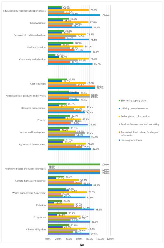 Local initiatives worldwide are tackling pressing environmental challenges, particularly the “triple crisis” of climate change, ecosystem degradation, and pollution/waste [116]. Notably, 135 initiatives highlight ecosystem conservation as a core concern, positioning it as a top regional priority related to food. Following this, climate change mitigation and waste reduction are each addressed by 62 initiatives (Figure 2a).